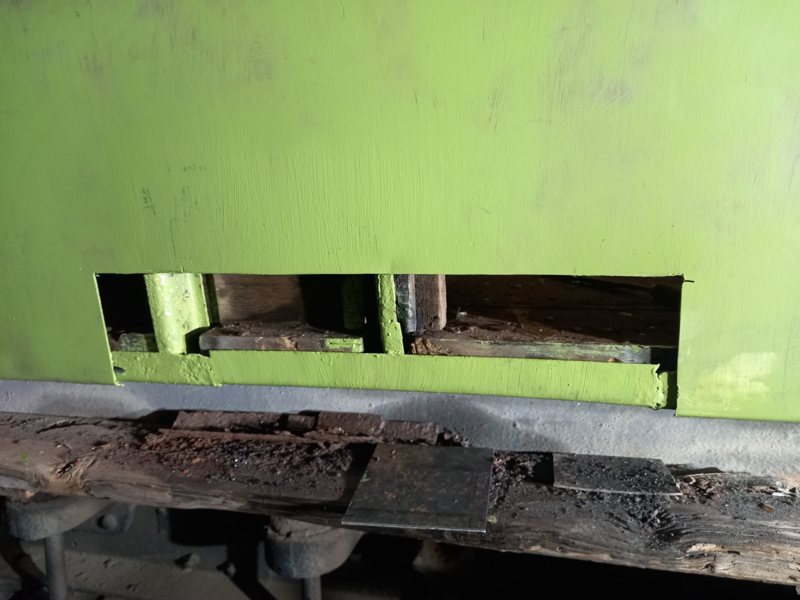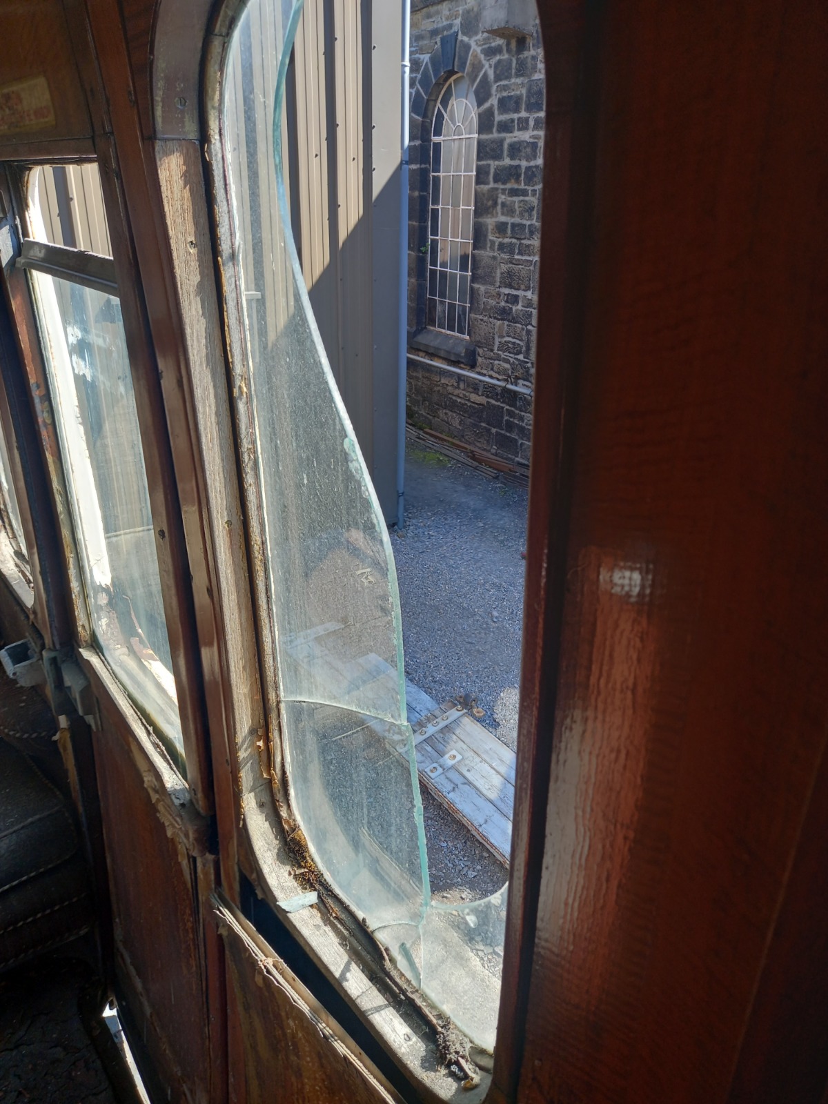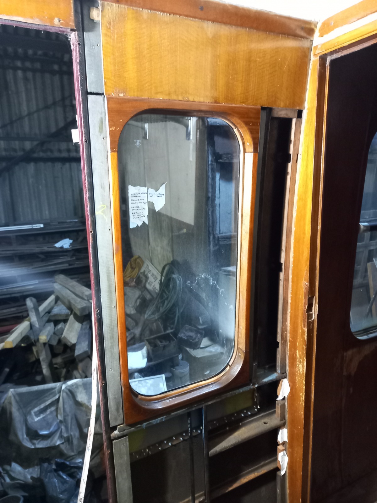 Unfortunately, the coach had to be stored outside for a few months until some shed space was freed up. In that time, it was displayed next to the BCK during the summer beer festival to try and raise some money to start the restoration. £1028 was raised, which is a fantastic amount that we are grateful for. It helped buy us a new timber door frame as well as some metalwork to help us rebuild our first door. We also bought new glass to replace the broken and cracked panes.
