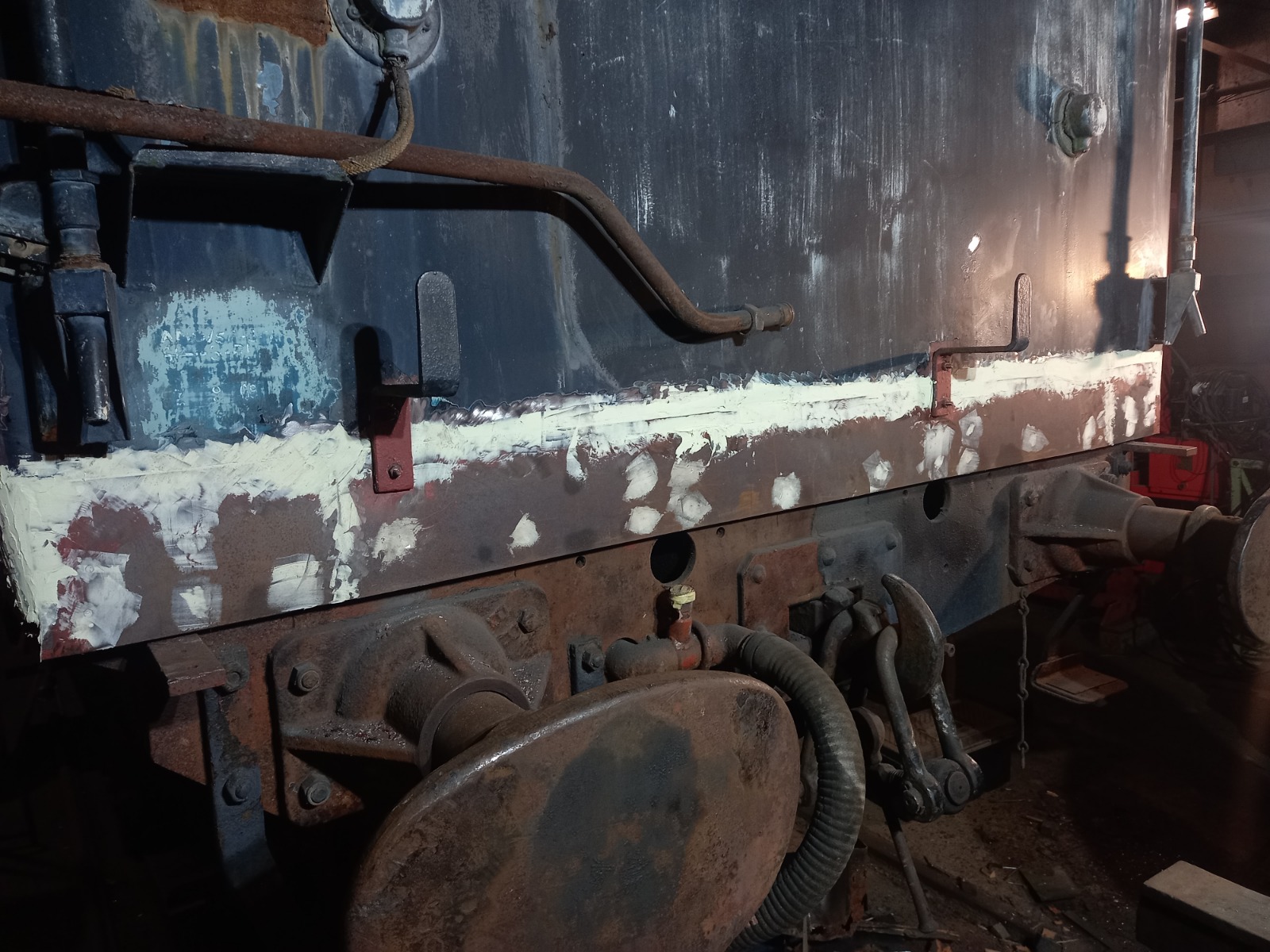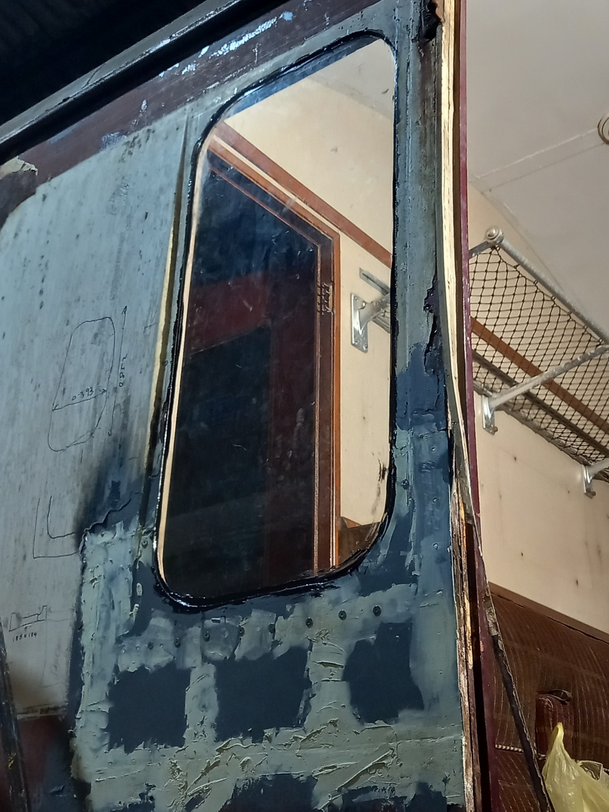 This was the broken window in the first-class end compartment. We replaced the corroded parts of the body framing and body skin as well as fitting a shiny new window to replace the broken one. All the other windows will need taking out and resealing along with metalwork repairs if necessary.