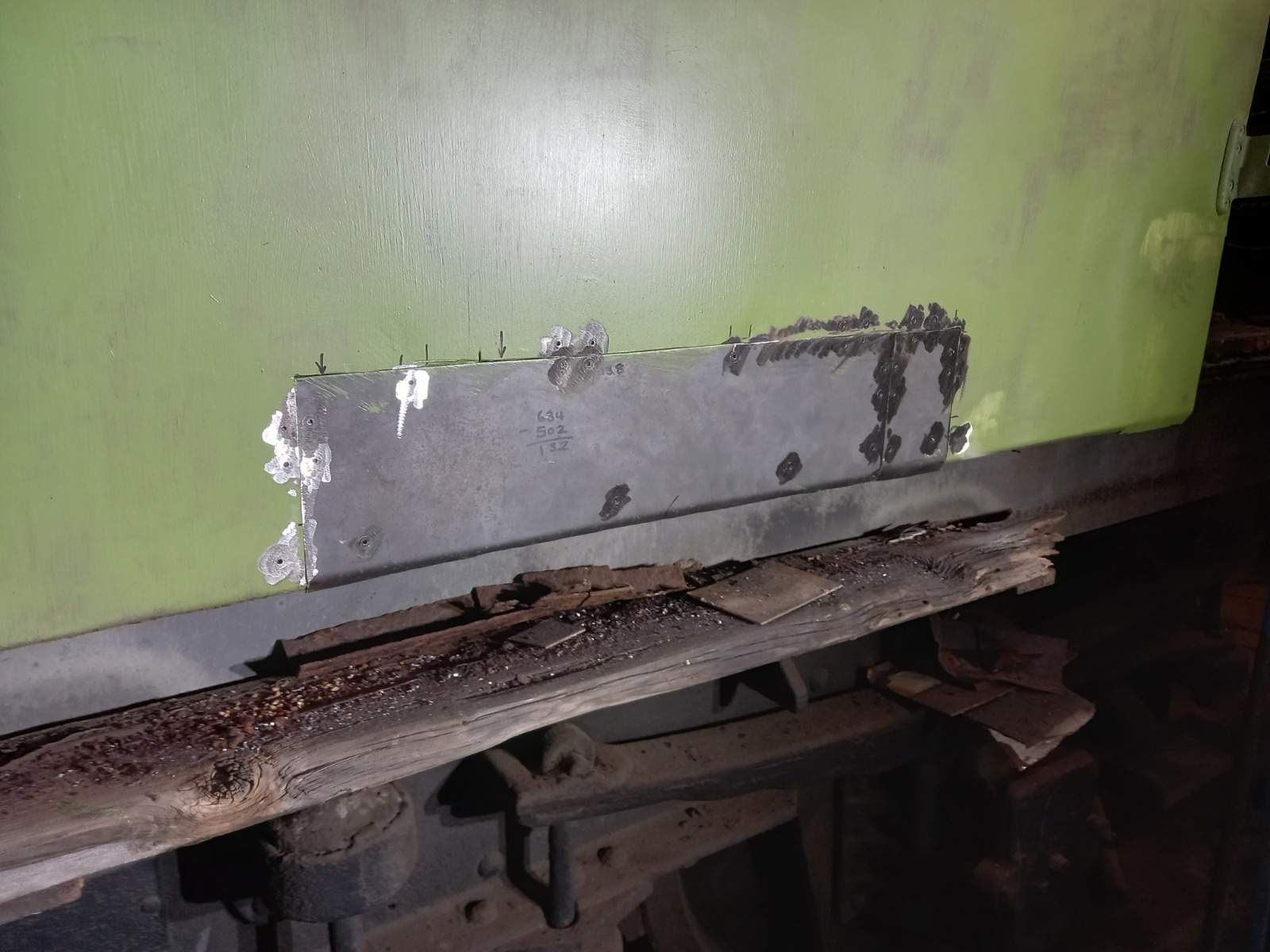 Crash pillars are a vital part of the body structure as they help prevent ‘telescoping’ in the event of a crash. This is when one vehicle rides up and enter the passenger space of another. On Mark 1s the communication cord end pillars normally rot at the bottom due to water ingress. The corrosion on the body skin showed that the CL had been a victim of this, so we had to fix it. We removed a strip at the bottom of the coach and found some holey crash pillars. They were in better condition than we expected with only the 2 outer pillars requiring new metal. This was done, and we fitted some new sheet metal to replace the old skin.