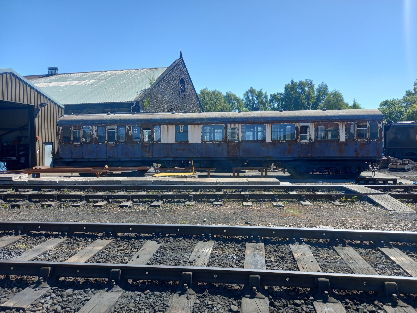 After a nearly 600-mile lorry journey the coach arrived safely at Chappel. We put it into the platform for a weekend shortly after it arrived to give it a good sweep out and to see if we could do anything about the doors, most of which are seized shut. The coach was used as storage at the Strathspey therefore there was a lot of debris that needed clearing. It looked much better afterwards.